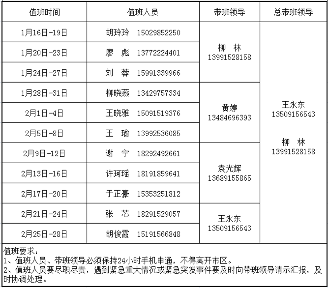 2021年寒假期间安全工作值班安排