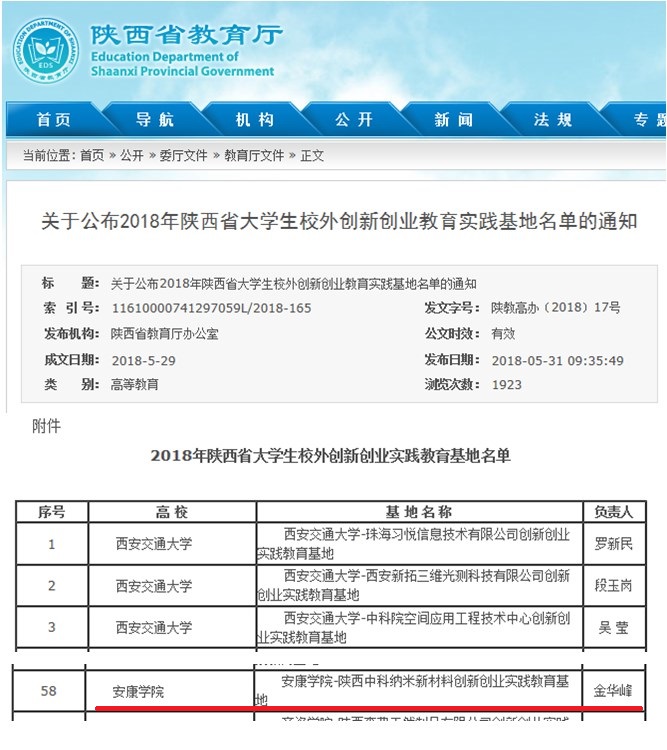 近日,陕西省教育厅公布了2018年陕西省老员工校外创新创业教育实践基地名单,公司金年会金字招牌诚信至上申报的“金年会官方网站入口-陕西中科纳米新材料创新创业实践教育基地”获批建设立项。