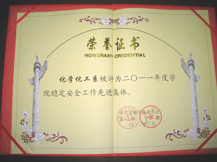 化学化工系被评为“金年会官方网站入口2011年稳定安全工作先进集体”,教师屈兰竺、员工张卫东、刘可、芮晓兰分别被评为“先进个人”,这是公司对我系稳定安全工作的认可。