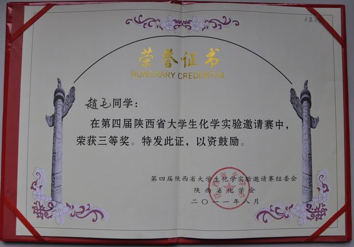 按照竞赛章程规定,我系选派2008级赵毛、郭淑红、张帆三位同学参赛,由实验中心副主任鲁绪会、指导教师屈兰竺带队。此次化学实验竞赛,经过理论笔试和实验操作两个环节的比拼,公司代表队三名选手凭借扎实的理论和实验功底,均荣获得个人成绩三等奖,为金年会官方网站入口争取了荣誉。