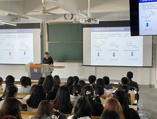 文思博士首先介绍了硫叶立德的发展及相关反应的研究背景,阐述了该试剂在有机合成中的应用前景,以合成的酰基硫叶立德和CF3-亚胺基硫叶立德作为反应底物,对反应条件进行筛选优化合成一系列含氧、含氮杂环化合物。最后结合自己的科研经历,向参会师生介绍了有机合成工作的日常。